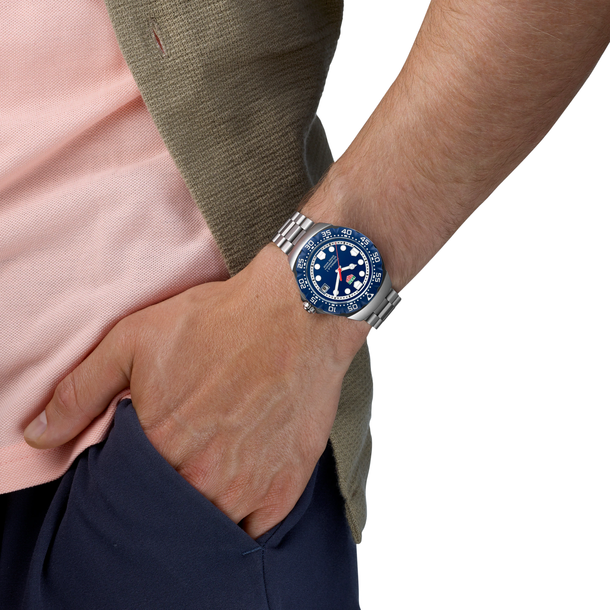 Case baja 38 mm dengan finishing sand-blasted membuat jam ini terasa kokoh tapi nggak terlalu berat. Bezel-nya terbuat dari material inovatif TH-Polylight, dan terlihat kontras dengan dial biru yang segar. Indeks dan jarumnya dilapisi Super-LumiNova®, jadi kamu bisa tetap membaca waktu bahkan saat malam atau di ruangan gelap.