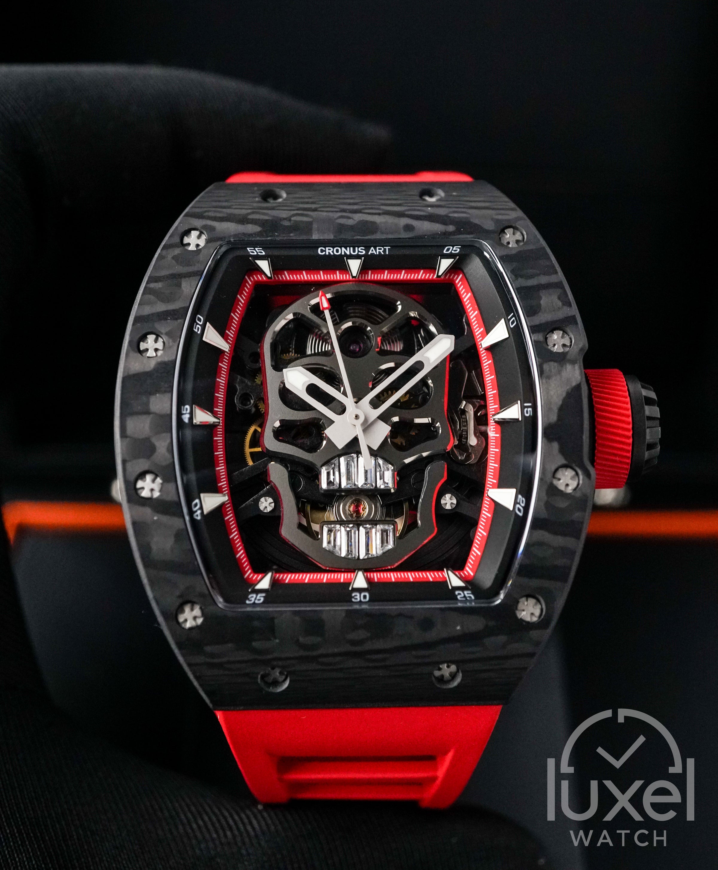 Cronus Art mempersembahkan Gemstone Skull Red Black, sebuah jam tangan yang menghadirkan kontras menawan antara keanggunan dan keberanian. Casing NTPT Carbon Fibre berukuran 42mm x 50mm memberikan kekuatan dan ketahanan, sementara desain tengkorak dangan aksen merah pada dialnya menciptakan pernyataan visual yang berani. Kombinasi warna ini tidak hanya menarik perhatian, tetapi juga mencerminkan dualitas antara cahaya dan gelap, menjadikannya pilihan ideal bagi mereka yang menyukai desain yang unik dan berkarakter.