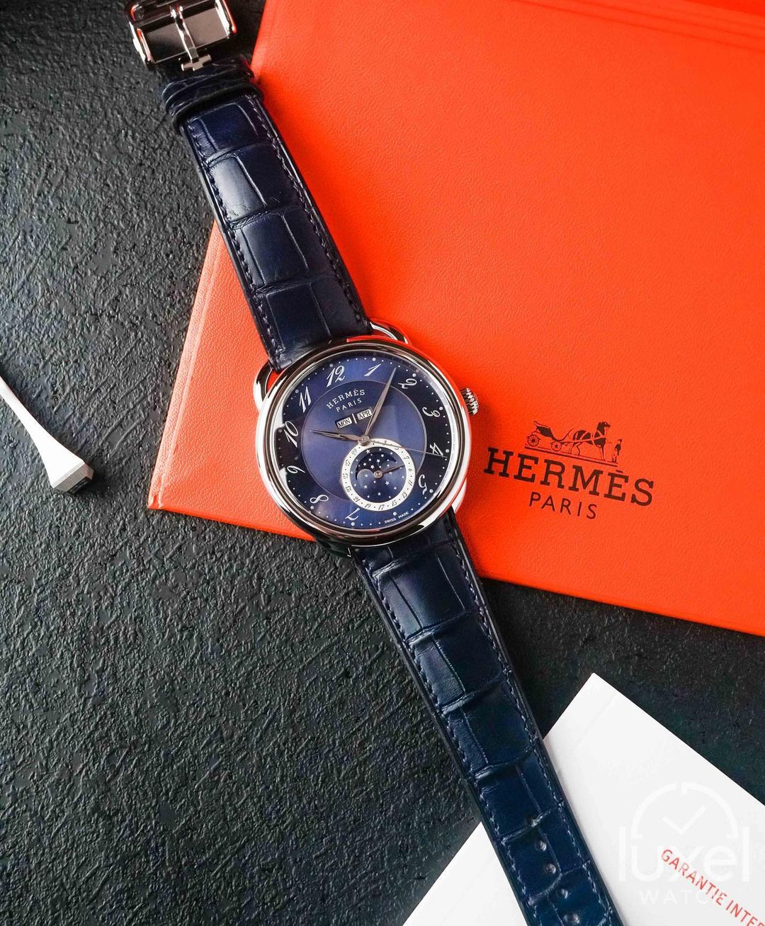 "Tambahkan sentuhan elegan pada gaya Anda dengan keindahan klasik jam tangan Hermes Arceau Grande Lune yang mewah."