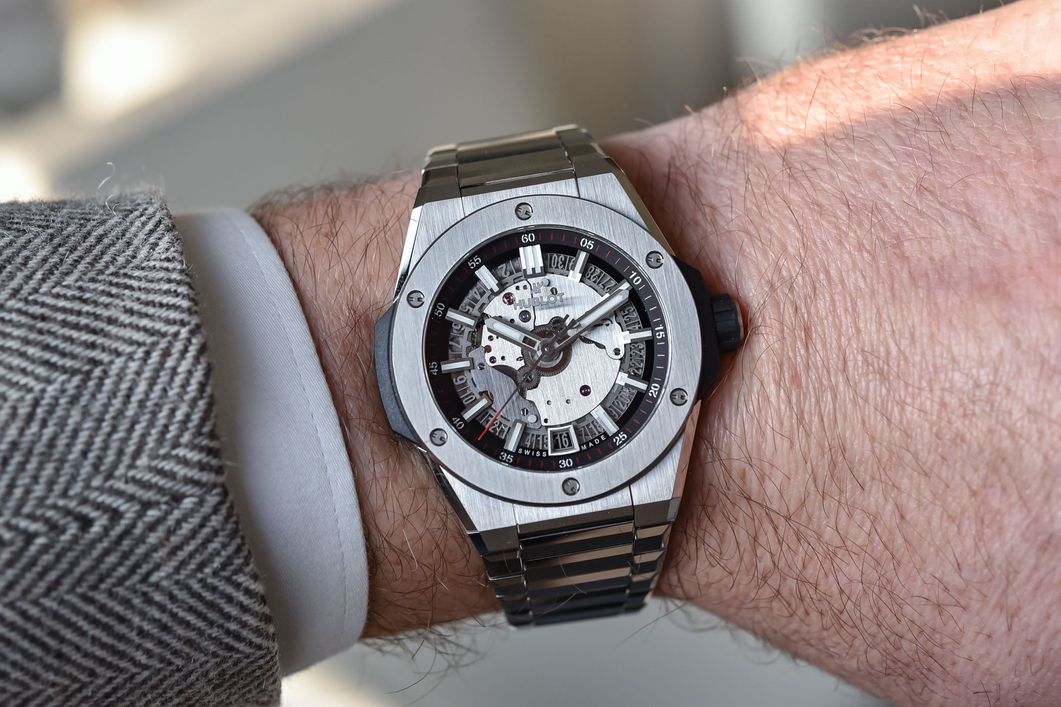 Menggabungkan kemewahan dan teknologi mutakhir, Hublot Integrated Time Only Titanium akan memukau Anda sejak pandangan pertama. Jam tangan ini memiliki kasus polos titanium 40mm yang halus dan elegan dengan tampilan skeleton yang memamerkan mesin HUB1710 Self-winding Movement yang presisi dan andal dengan frekuensi 28.800 vph (4hz) dan daya tahan baterai selama 50 jam. Dengan fitur tanggal pada posisi 6 o'clock, tampilan jam ini semakin komplit dan praktis.