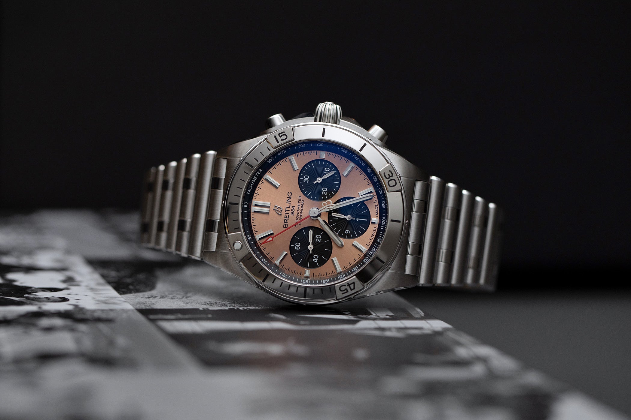 "Tampil Berbeda dengan Elegan dan Kuat dengan Dial Salmon yang Unik dari Breitling Chronomat B01."